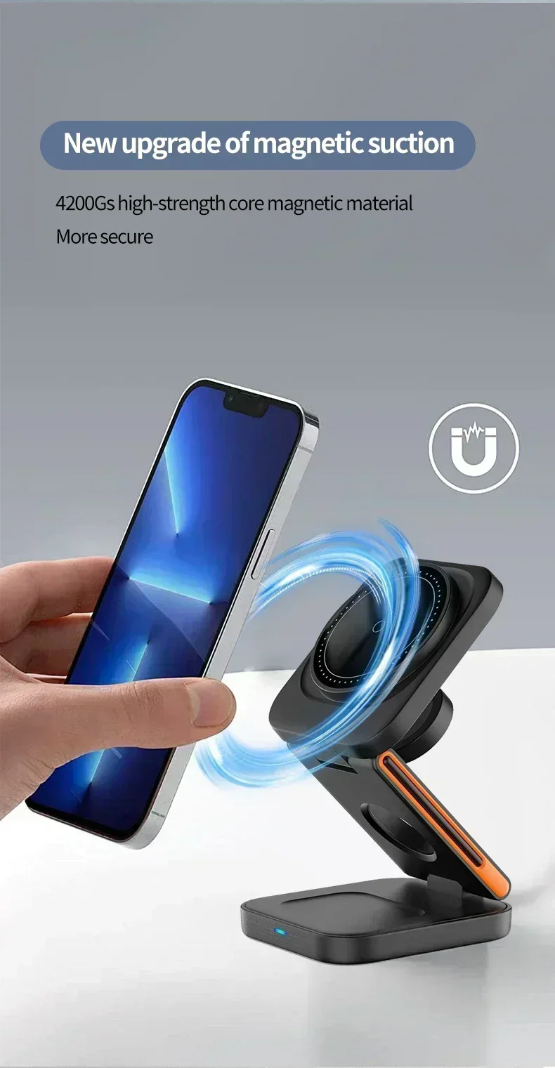 ?Carregador sem fio 3 em 1?:A estação de carregamento sem fio 3 em 1 para carregador Apple MacSafe para vários dispositivos é uma ótima opção para organizar sua casa, escritório ou sala de reuniões.Ele permite que você diga adeus aos cabos emaranhados e bagunçados, mantendo seu espaço limpo e organizado, tornando-o uma solução de carregamento conveniente para seu estilo de vida agitado.